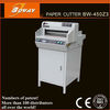 Main Feature of paper cuttter 450Z: 1.Patent of Independent clamp paper Different pressure to different kinds of cutting materials, solve spring-press precision not high, improve efficiency. 2.Automatic paper push-out after cutting Automatic paper push-out, save time and promote efficiency 3.High speed, powerful motor High speed, force and thickness, make the Max thickness up to 50mm, meet different cutting need. 4.High quality alloy blade capable for more than 12000 times cutting 5.Patent of blade adjustment from outside of machine The blade depth can be adjusted at will from outside avoid incomplete cut 6.Lengthened front worktable Extended front worktable is enough to cut 460mm paper by half inside the safety cover, safer and more assured. 7.Digital control Numerical control keypad, input cut size easily (450Z) 8.LCD display Direct viewing operational signal,error alarms,be clear at a glance,convenience and fast. 9.Safety CE standard, two hand operation, infrared wall protection, air breaker protect etc. Main parameter of paper cutter Item450 Series PaperCutterBW-450V7BW-450Z3Clamp paperAutomaticAutomatic(motor)Push paperManualAutomaticMax cutting width450mm450mmMax Cutting Height50mm50mmPrecision<0.5mm<0.5mmCutting length behind knife450mm450mmTable length in front knife35mm46mmPowerOptionalOptionalShipping Dimension (mm)920x750x71 108x750x1280 Gross Weight120Kgs150Kgspaper cutter CE SGS TUV ISO BW-450Z3